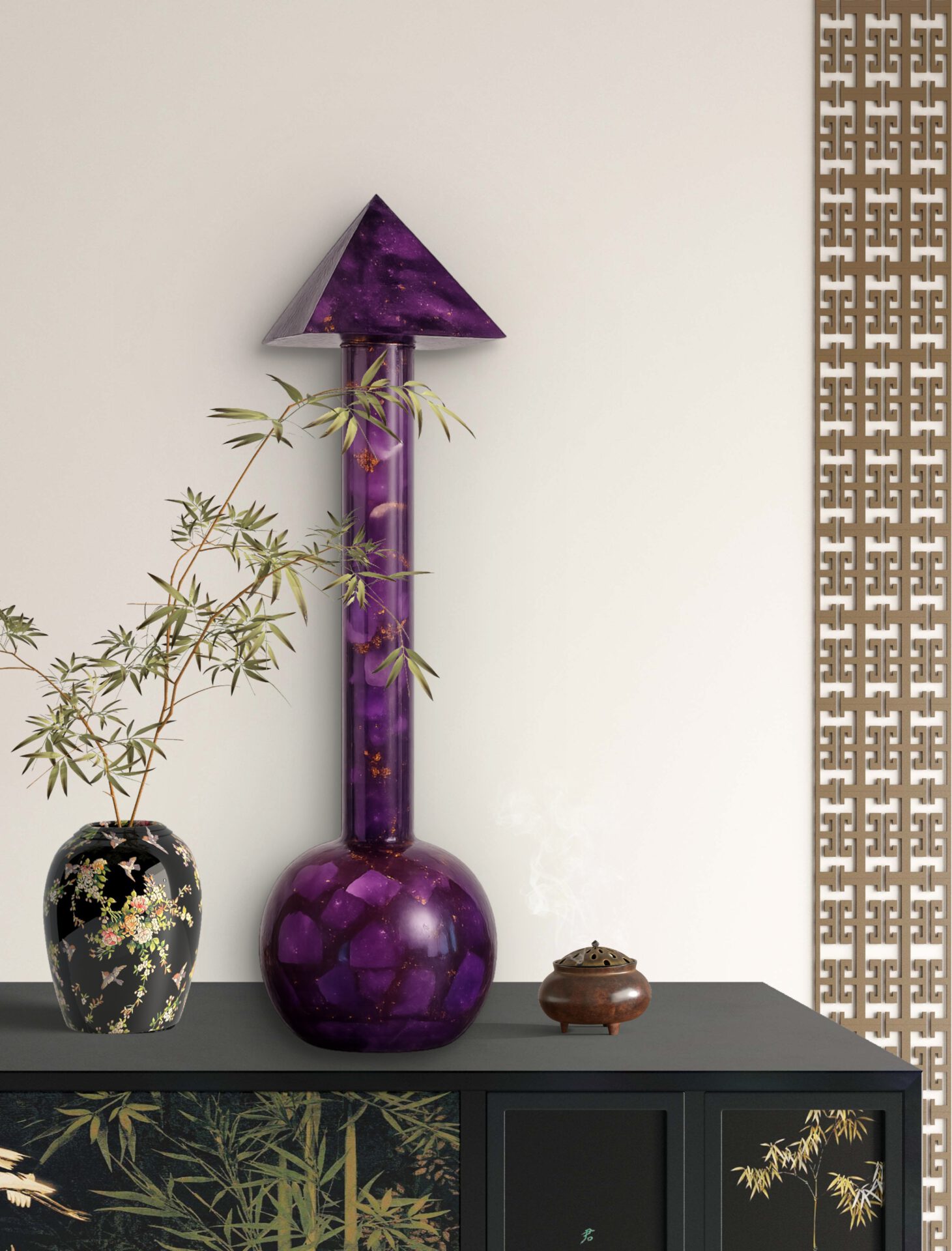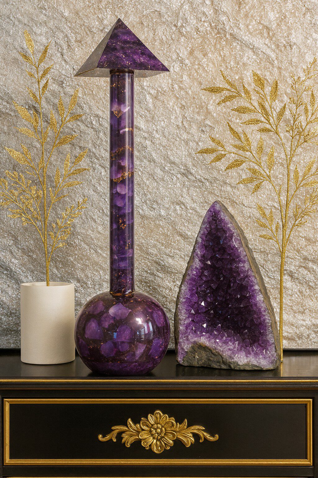 Der schwere, violett schimmernde Sockel – durchzogen von Amethysten, Goldpartikeln und tiefen Kristallstrukturen – bildet das Fundament. Er erinnert an die Kraft der Erde, an Stabilität und Verwurzelung. Aus dieser Basis erhebt sich der schlanke, transparente Mittelteil, gefüllt mit fein geschliffenen Bergkristallspitzen. Er entfaltet einen klaren, aufsteigenden Energiefluss – ein visueller Atemzug zwischen Dichte und Leichtigkeit.