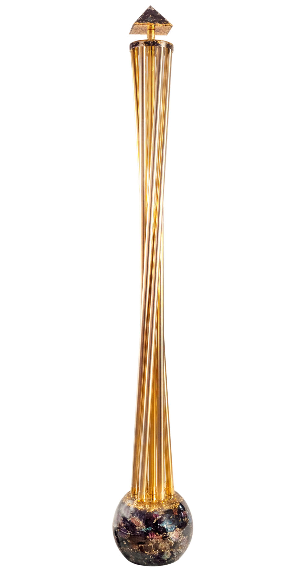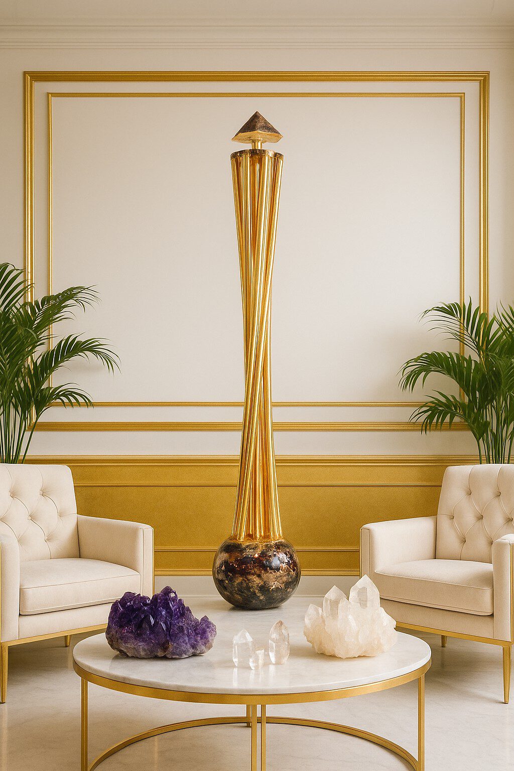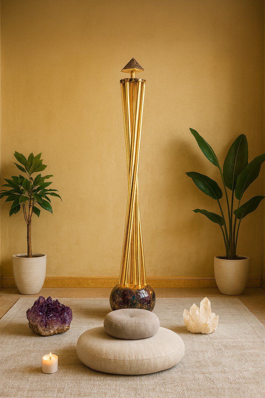 Die darüber aufsteigenden Lichtstäbe entfalten durch 24k-vergoldetes Kupfer eine starke, klare Energie. Ihre spiralförmige Bewegung strukturiert den Raum wie ein aufgerichteter Kanal, der Fremdenergien neutralisiert und das Nervensystem entlastet.