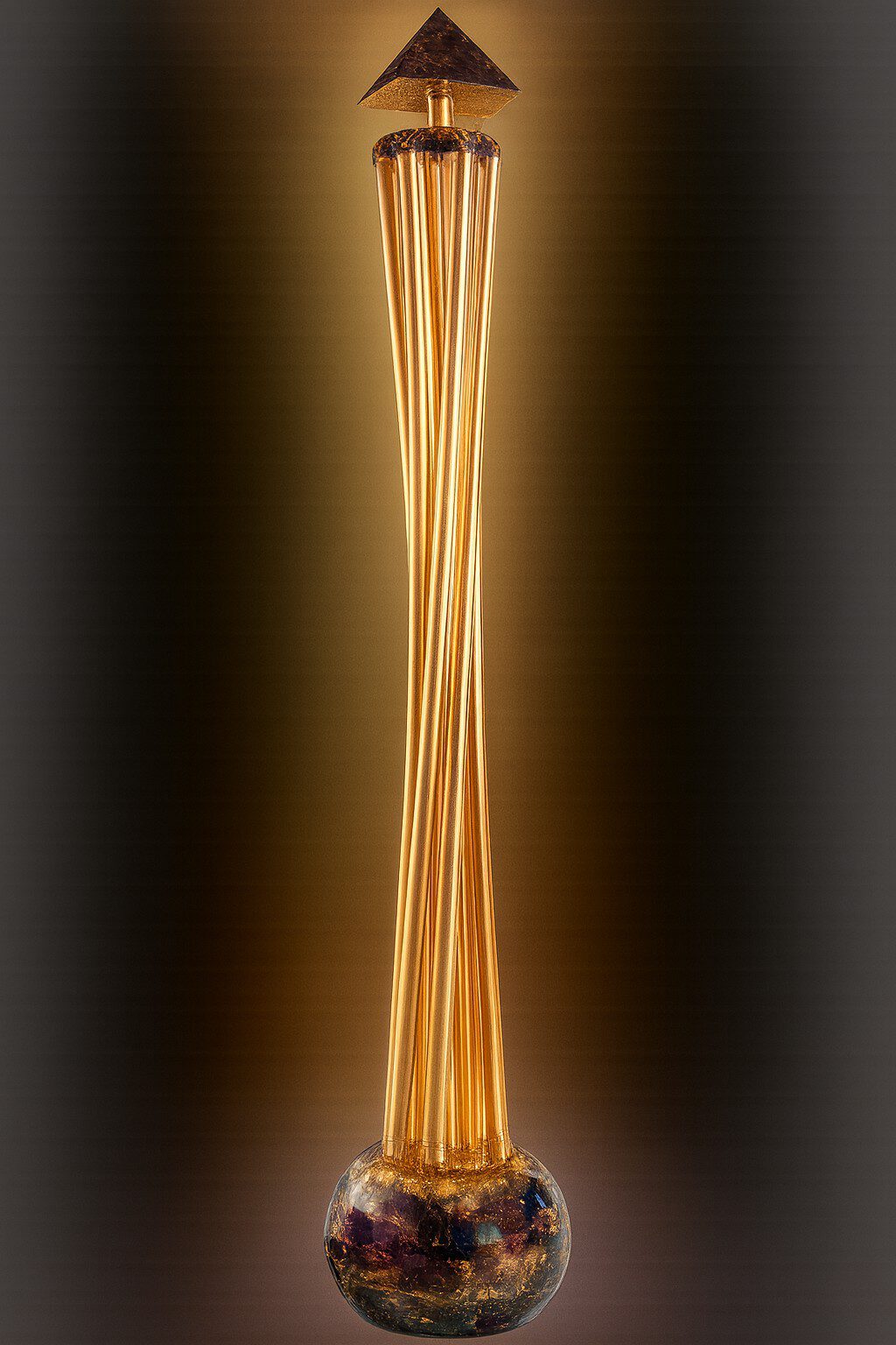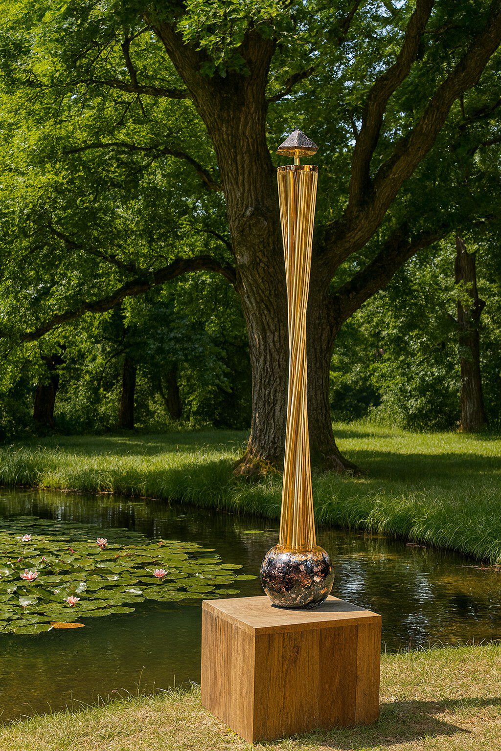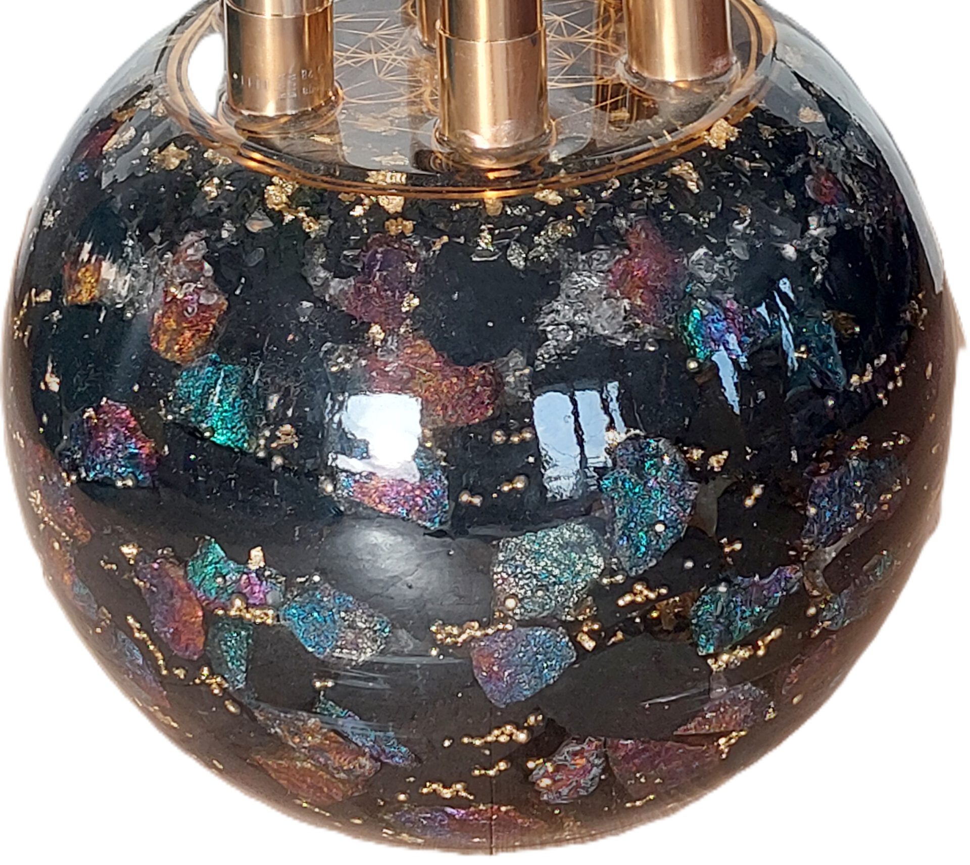 Die darüber aufsteigenden Lichtstäbe entfalten durch 24k-vergoldetes Kupfer eine starke, klare Energie. Ihre spiralförmige Bewegung strukturiert den Raum wie ein aufgerichteter Kanal, der Fremdenergien neutralisiert und das Nervensystem entlastet.