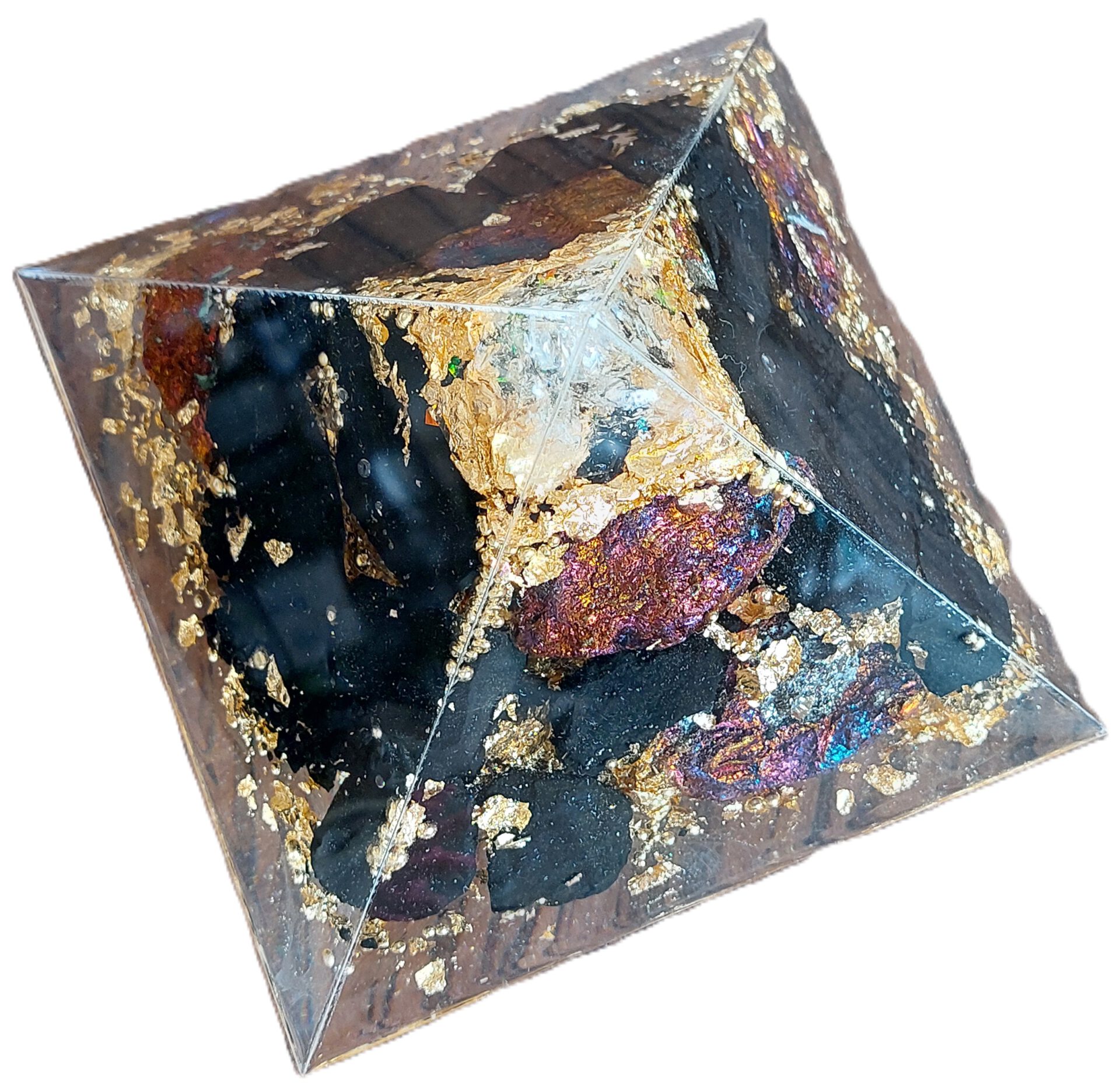 Die dunkle Pyramide an der Spitze bündelt diesen Kraftstrom zu einer ruhigen Mitte. Ihr Schwarz steht für Wandlungsfähigkeit, Tiefe und die Kraft, Unklares in Klarheit zu verwandeln. So entsteht ein atmosphärisches Energiefeld von Zentrierung und Stabilität – ein Ort, an dem Enge sich löst und Präsenz wieder spürbar wird. „Schutz“ eignet sich für Eingangsbereiche, Praxen, Arbeits- und Beratungsräume sowie für private Wohnräume, die Sicherheit, Klarheit und Stabilität tragen dürfen.