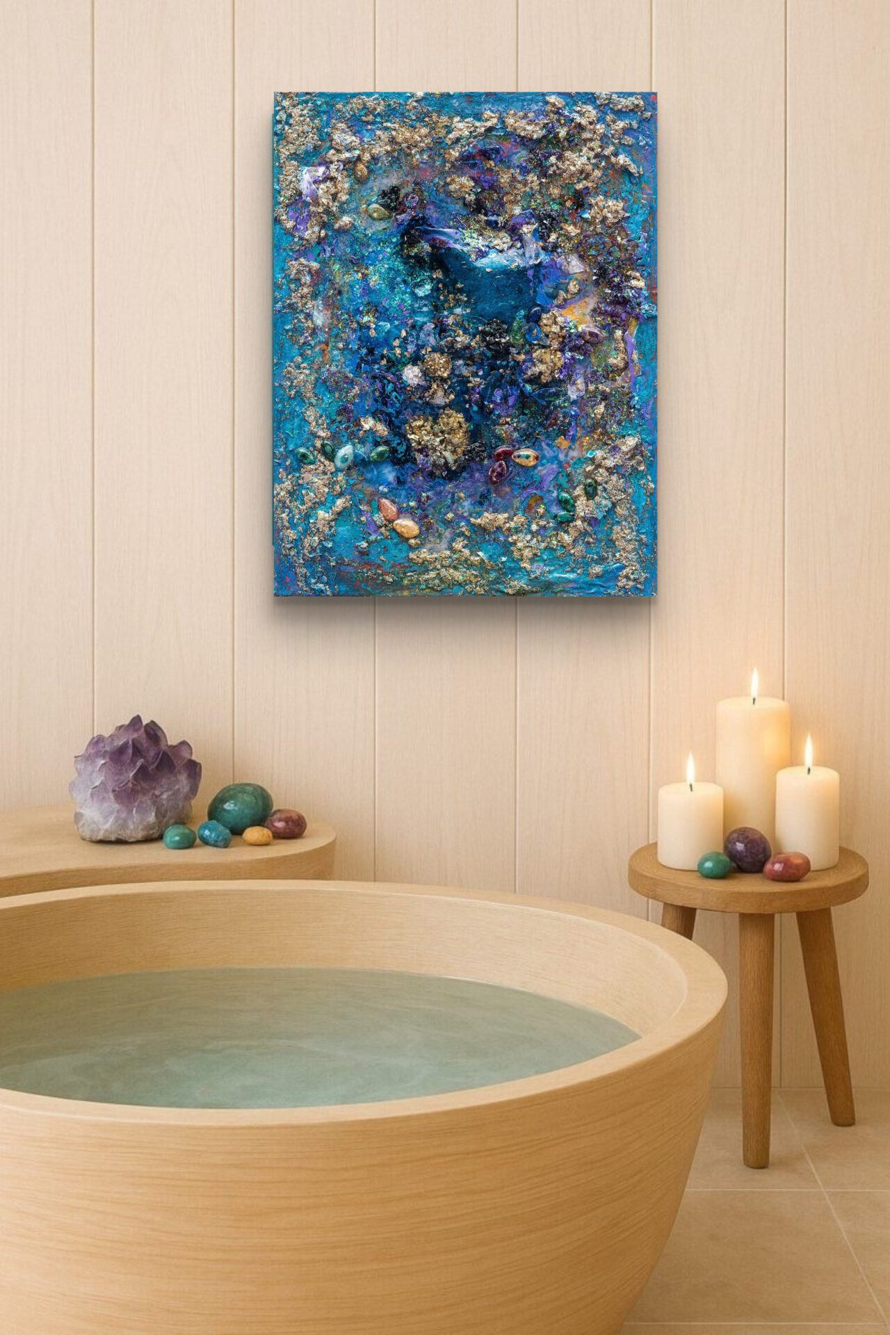 Dieses Kunstwerk weckt Erinnerungen an die Legenden von Atlantis – an das versunkene Reich des Lichts, in dem Wissen, Heilung und Bewusstsein im Einklang mit der Natur flossen. Es ist eine Ode an das Element Wasser: reinigend, empfangend