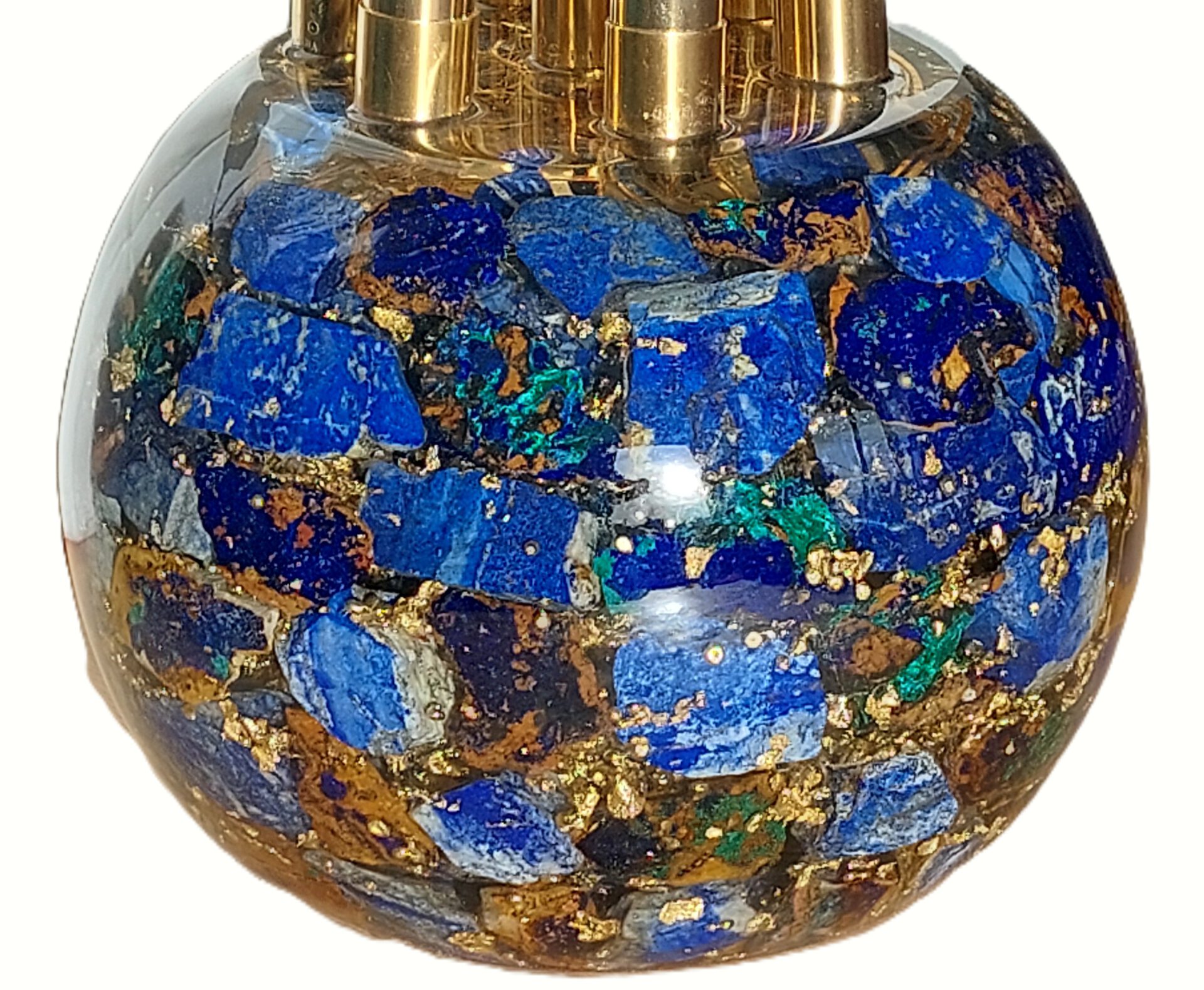 Der schwere Sockel ist durchzogen von Bergkristall, Sodalith, Blaufluorit, Labradorit und hochwertigem Lapislazuli – einem Mineral, das in seiner natürlichen Form aus dem tiefblauen Lasurit entsteht und von feinen Pyrit-Einschlüssen und zarten Calcit-Adern durchzogen ist.