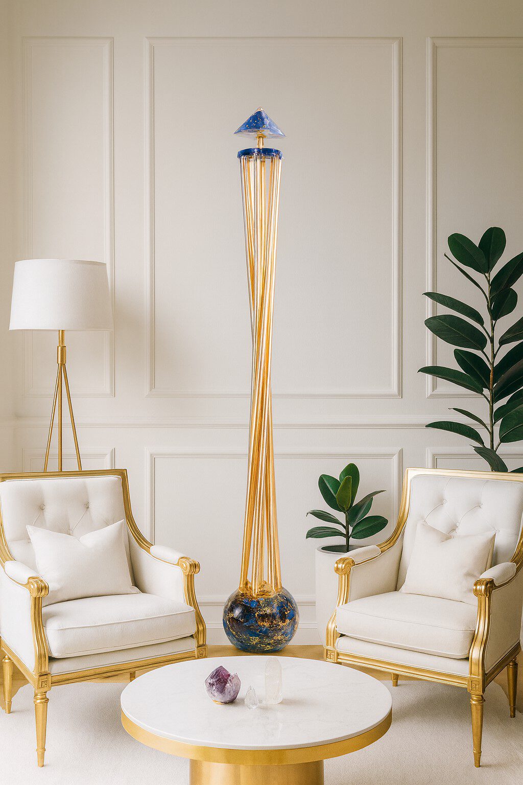 Aus dieser Basis erheben sich spiralförmige Lichtstäbe, deren warmer Fluss durch 24k-vergoldete Kupfersäulen verstärkt wird. Sie wirken wie ein schwebender Atemzug zwischen Himmel und Erde – ein Feld von Zentrierung und innerer Ausrichtung, das den Raum sichtbar wie feinstofflich strukturiert.
