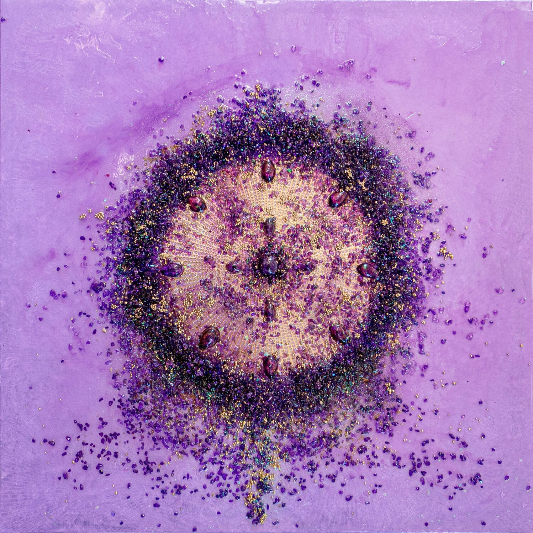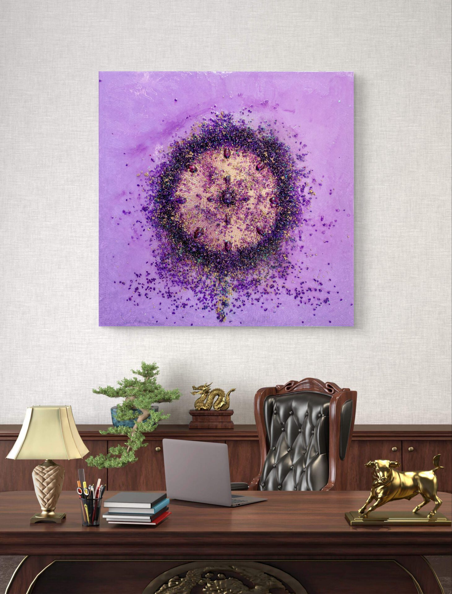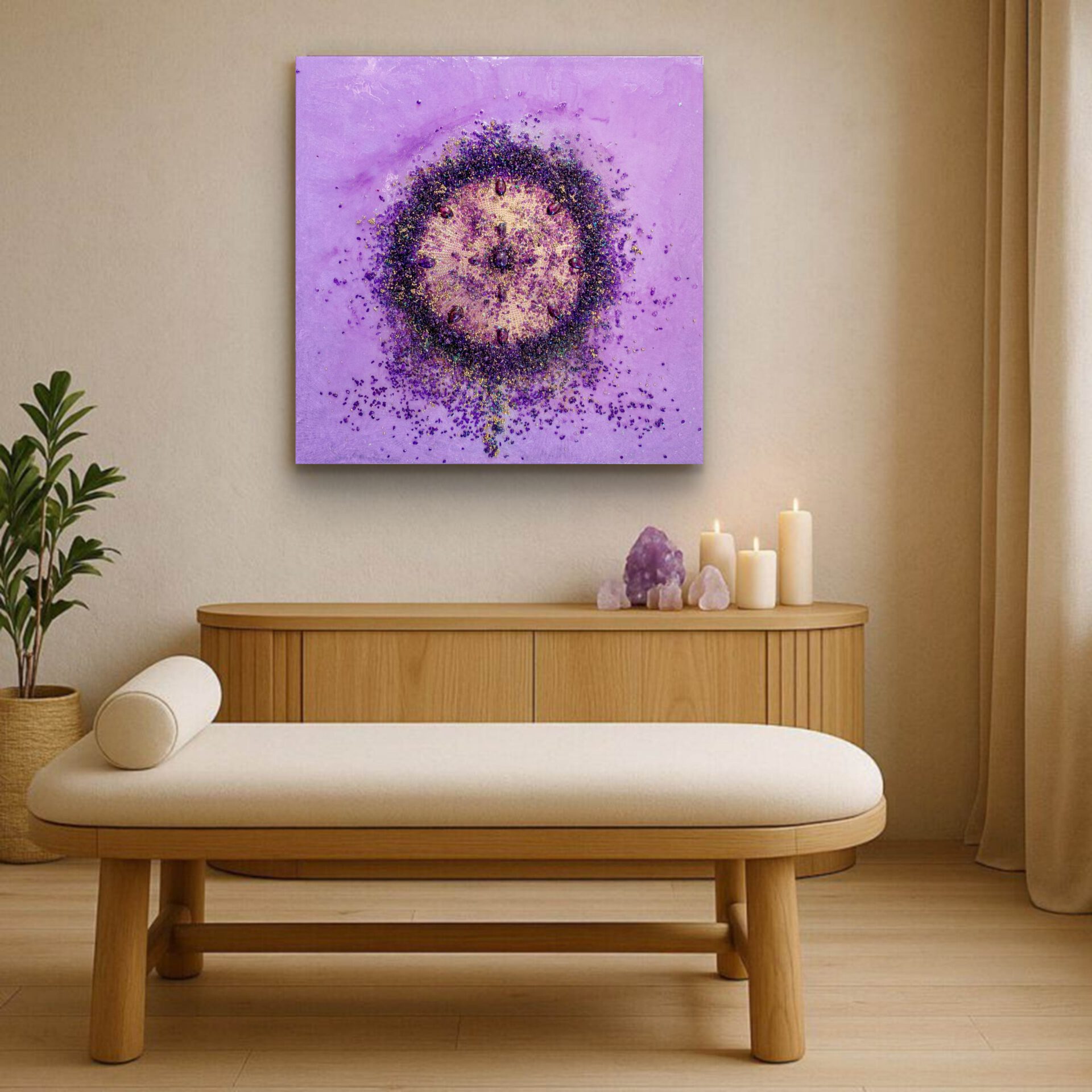 Das Zentrum, durchzogen von feinen Edelsteinen, entfaltet eine pulsierende Ausstrahlung. Es wirkt wie ein energetischer Verstärker, der Licht, Frequenz und Erinnerung in Schwingung bringt. Aus dieser Mitte breitet sich ein Feld von Präsenz und Weite aus – eine Einladung, sich an das ursprüngliche Leuchten des eigenen Seins zu erinnern und sich selbst in einem Transformationsprozeß immerwährend neu zu erschaffen. Die Komposition in kräftigen Violett-, Gold- und Amethysttönen symbolisiert Balance und Einklang. Violett steht für geistige Kraft und Verwandlung, Gold für Weisheit, Fülle und Strahlkraft.