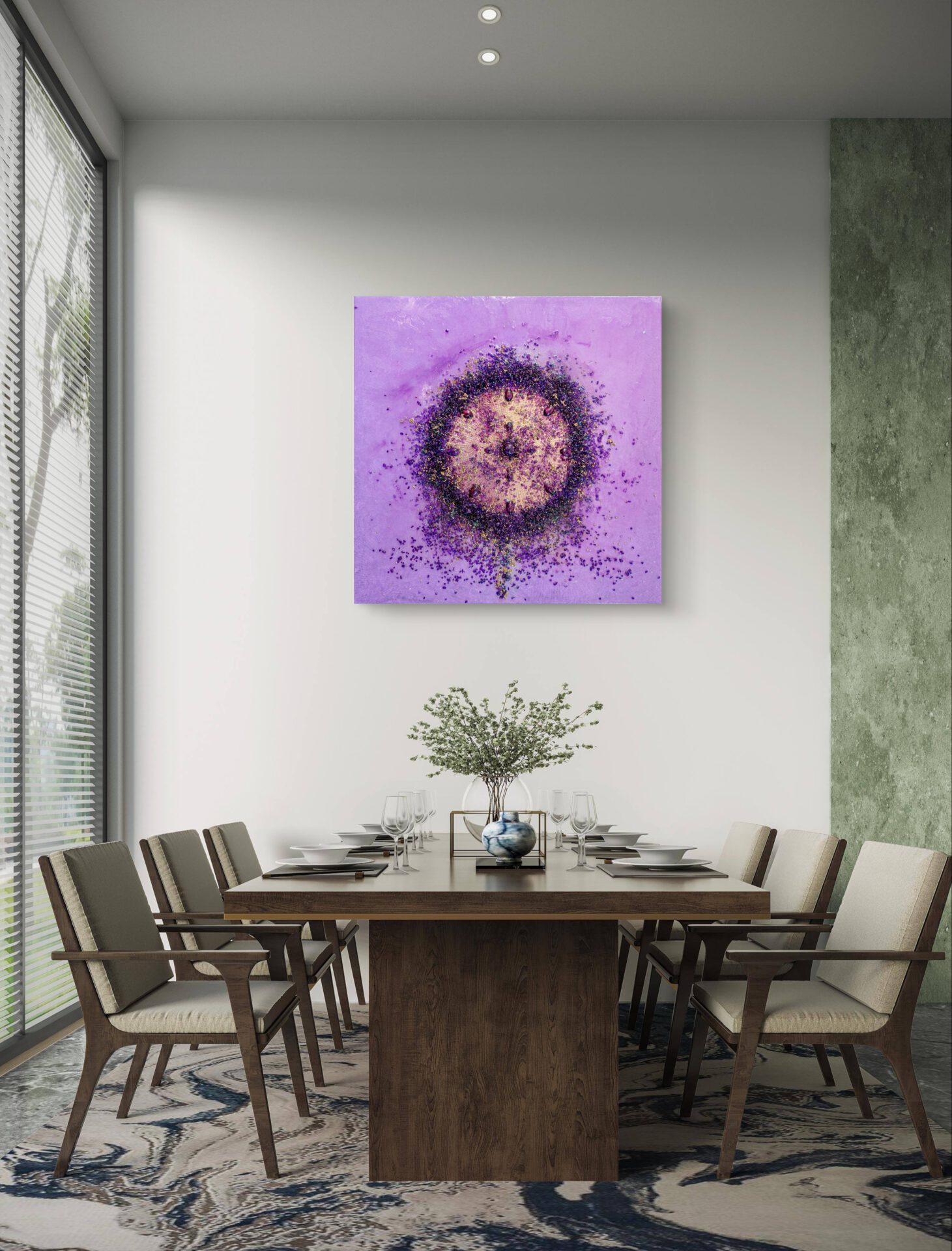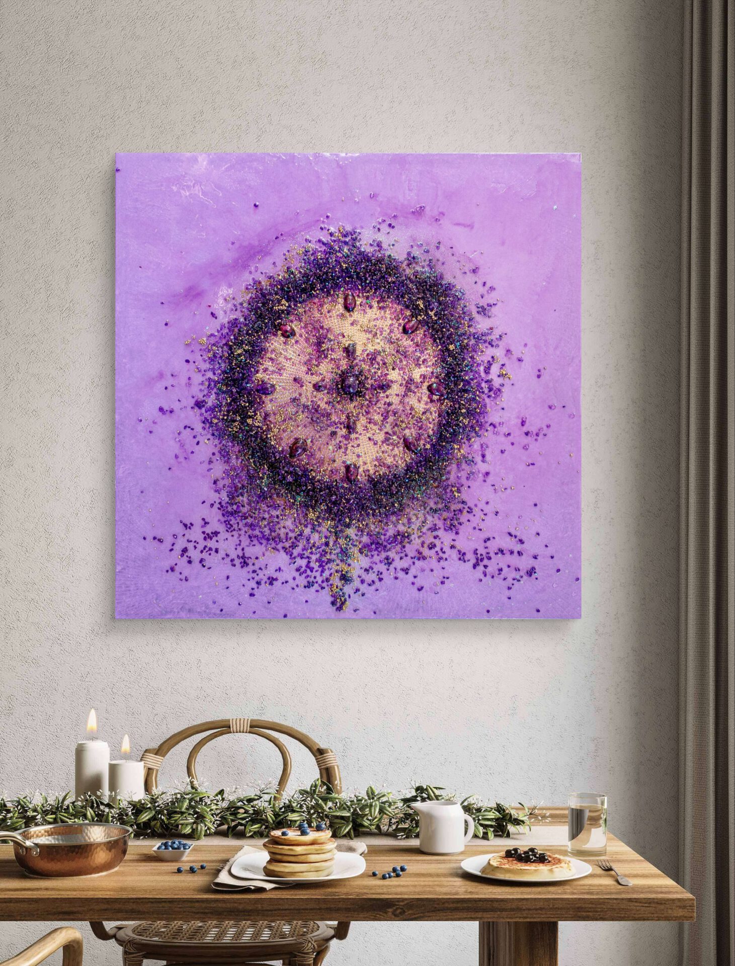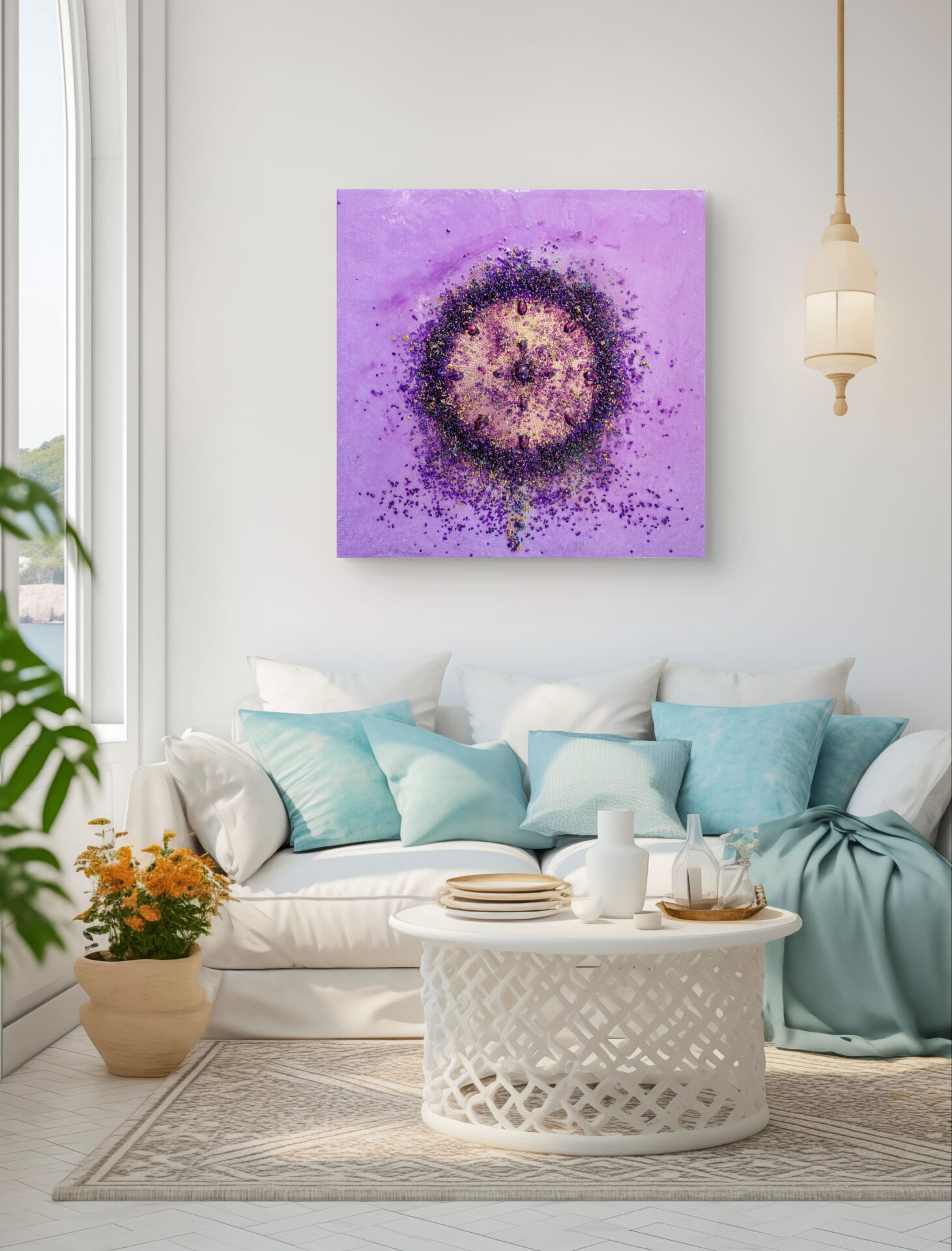 Das Zentrum, durchzogen von feinen Edelsteinen, entfaltet eine pulsierende Ausstrahlung. Es wirkt wie ein energetischer Verstärker, der Licht, Frequenz und Erinnerung in Schwingung bringt. Aus dieser Mitte breitet sich ein Feld von Präsenz und Weite aus – eine Einladung, sich an das ursprüngliche Leuchten des eigenen Seins zu erinnern und sich selbst in einem Transformationsprozeß immerwährend neu zu erschaffen. Die Komposition in kräftigen Violett-, Gold- und Amethysttönen symbolisiert Balance und Einklang. Violett steht für geistige Kraft und Verwandlung, Gold für Weisheit, Fülle und Strahlkraft.