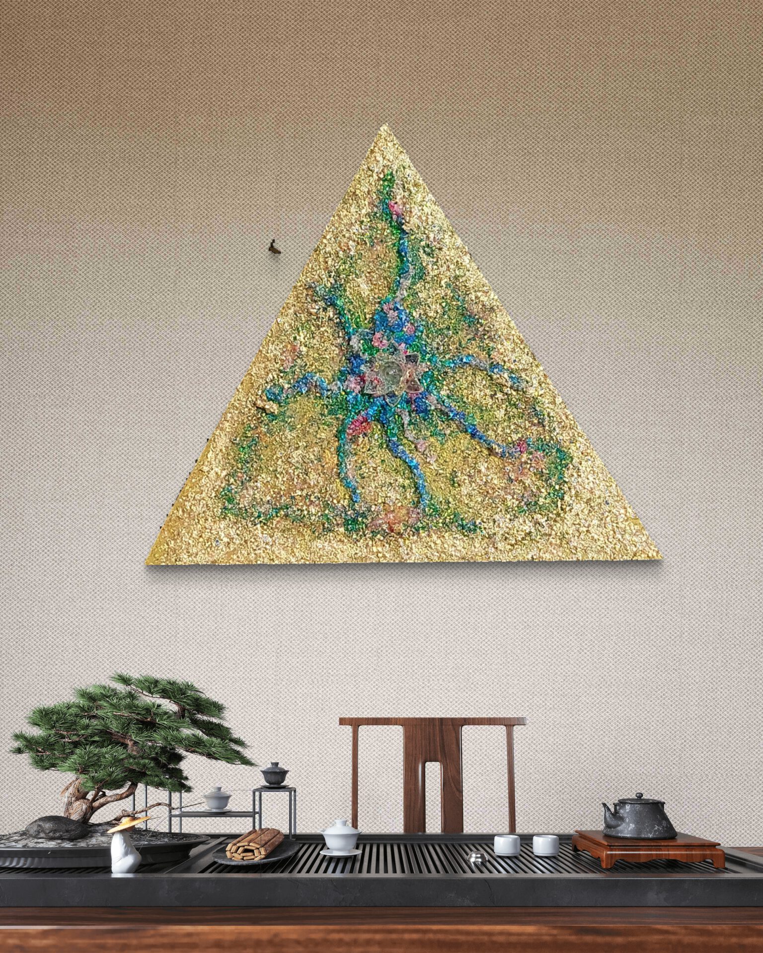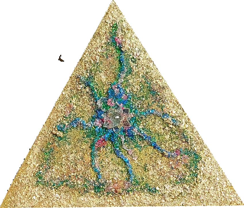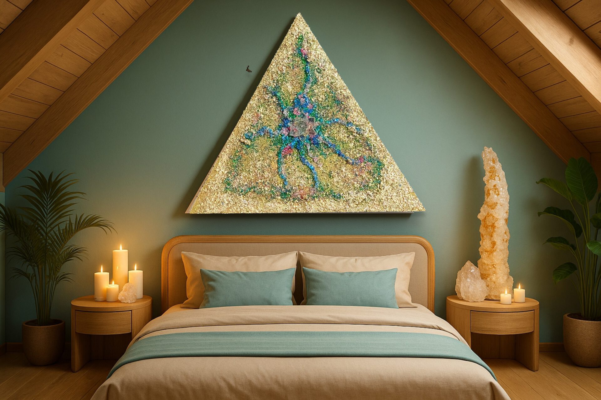 Die Komposition wirkt belebend, ordnend und regenerierend – ein Feld, das Körper, Verstand und Geist in Einklang bringt. Die dreieckige Form steht für Balance, Aufstieg und Transformation. Doch in dieser Pyramide offenbart sich die Energie des Lebens nicht entrückt, sondern geerdet: Das Licht steigt nicht nur auf, es durchdringt und nährt die Form – so wie Bewusstwerden durch Verkörperung geschieht. Im Zentrum ruht ein Kristallpunkt, der als Energiequelle wirkt.
