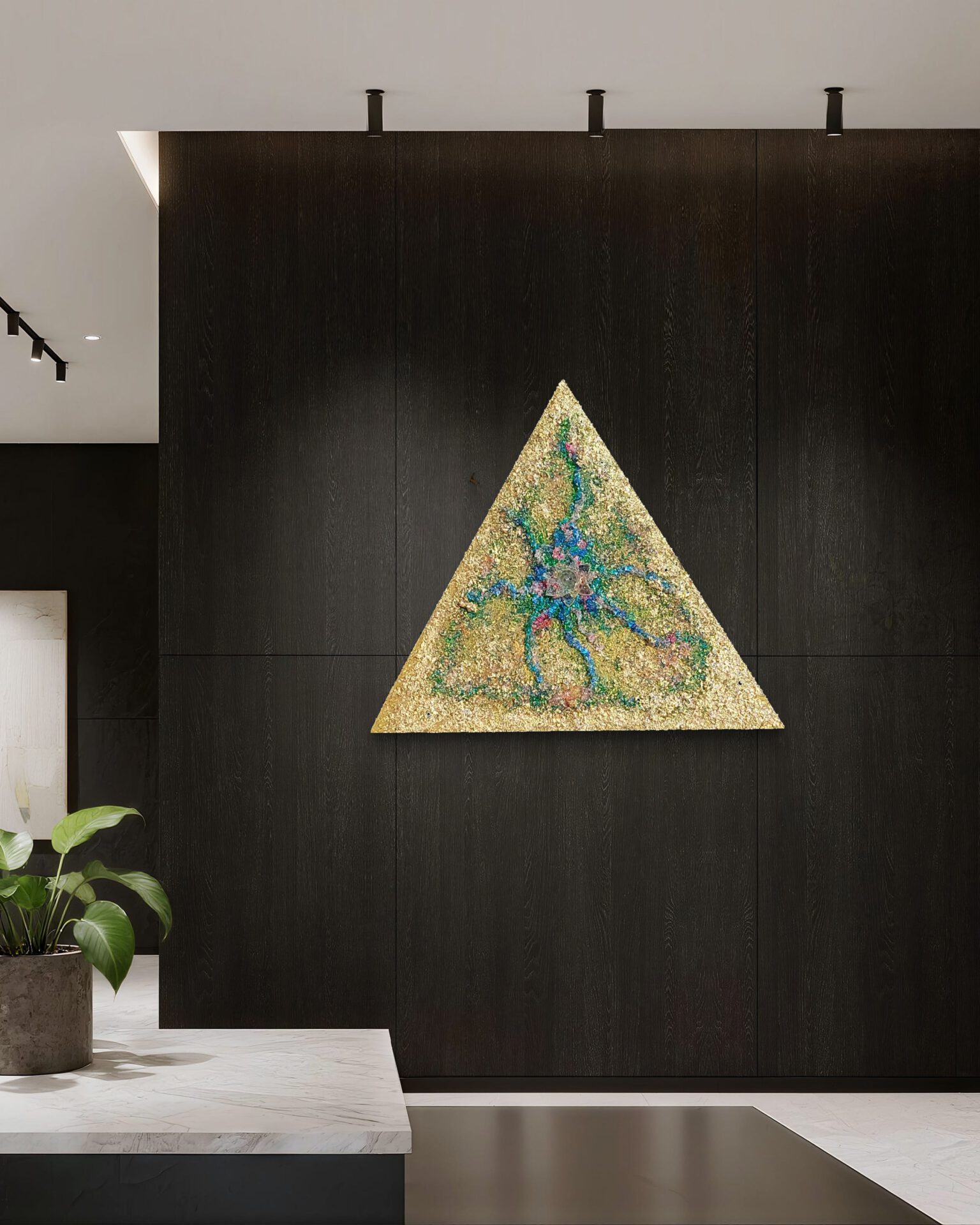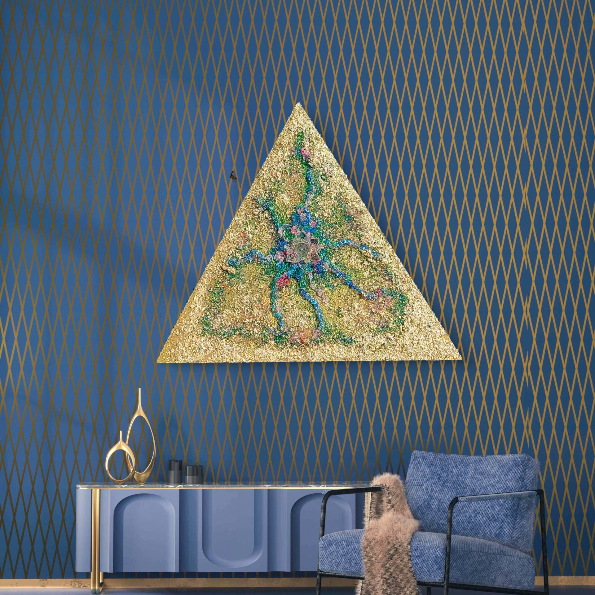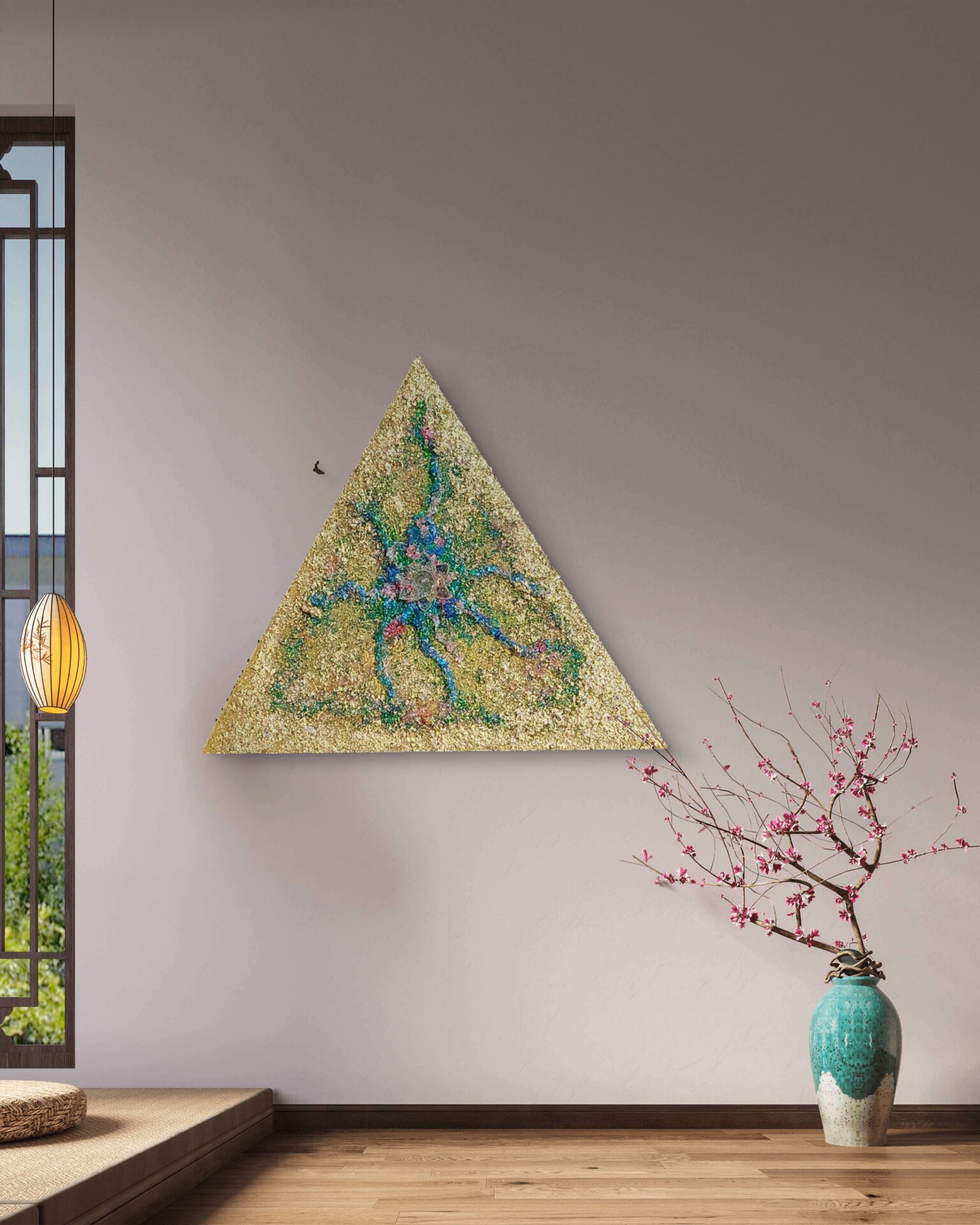 Die Komposition wirkt belebend, ordnend und regenerierend – ein Feld, das Körper, Verstand und Geist in Einklang bringt. Die dreieckige Form steht für Balance, Aufstieg und Transformation. Doch in dieser Pyramide offenbart sich die Energie des Lebens nicht entrückt, sondern geerdet: Das Licht steigt nicht nur auf, es durchdringt und nährt die Form – so wie Bewusstwerden durch Verkörperung geschieht. Im Zentrum ruht ein Kristallpunkt, der als Energiequelle wirkt.