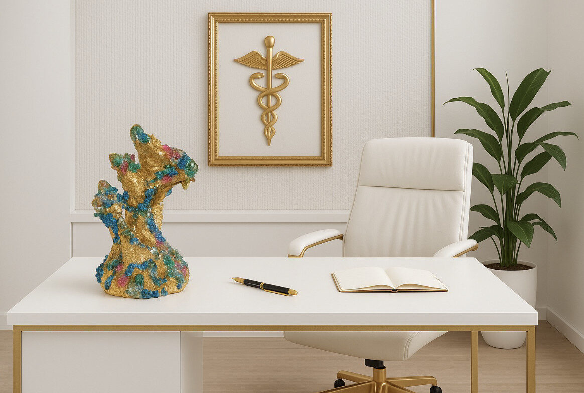 Diese Skulptur entfaltet sich wie eine goldene Welle des Lebens – organisch gewachsen, durchzogen von leuchtenden Kristallen in Türkis, Blau, Grün und Rosa. Sie wirkt wie ein pulsierender Ausdruck reiner Lebenskraft – ein sichtbarer Tanz zwischen Bewegung und Licht.